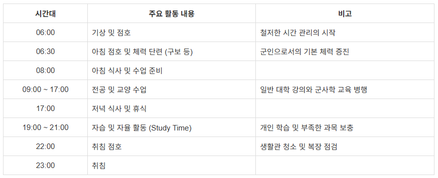 국간사 생도는 군인으로서의 훈련과 간호학 교육을 병행하므로, 일반 대학생보다 훨씬 체계적이고 규율 잡힌 하루를 보냅니다. 하계 기간을 기준으로 6시에 기상해서 22시에 취침점호를 하고, 23시부터 취침에 들어가는 것이 기본적인 하루 일상입니다. 아무래도 자유로운 일반 대학생의 생활과는 차이가 큽니다.